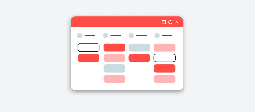 A minimalist calendar interface with red, pink and gray rectangular blocks arranged in a grid pattern, featuring navigation controls at the top